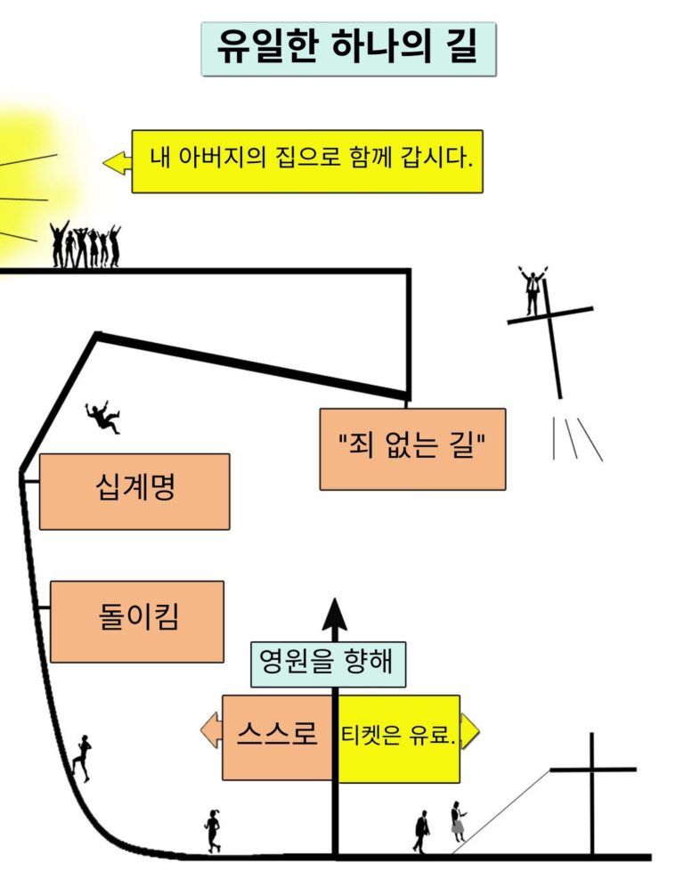 성경에 따르면 예수님은 하나님께 가는 유일한 길입니다. 그 밖에는 다른 길이 없습니다. 여러분은 선한 삶을 살 수 있고, 좋은 일을 많이 할 수 있지만, 그것이 여러분을 하나님께 더 가깝게 다가가게 하지는 못할 것입니다. 비록 당신이 착하고 친절한 사람일지라도 당신의 생각과 마음에는 여전히 죄가 있을 것입니다. 여러분은 예수님이 곁에 계시지 않으면 스스로 의롭다 하심을 받을수도 없고 하나님과 진실된 관계가 될 수도 없을 것입니다. 자신이 죄인이고 예수님의 대속하심이 필요하다는 것을 인정해야 합니다.